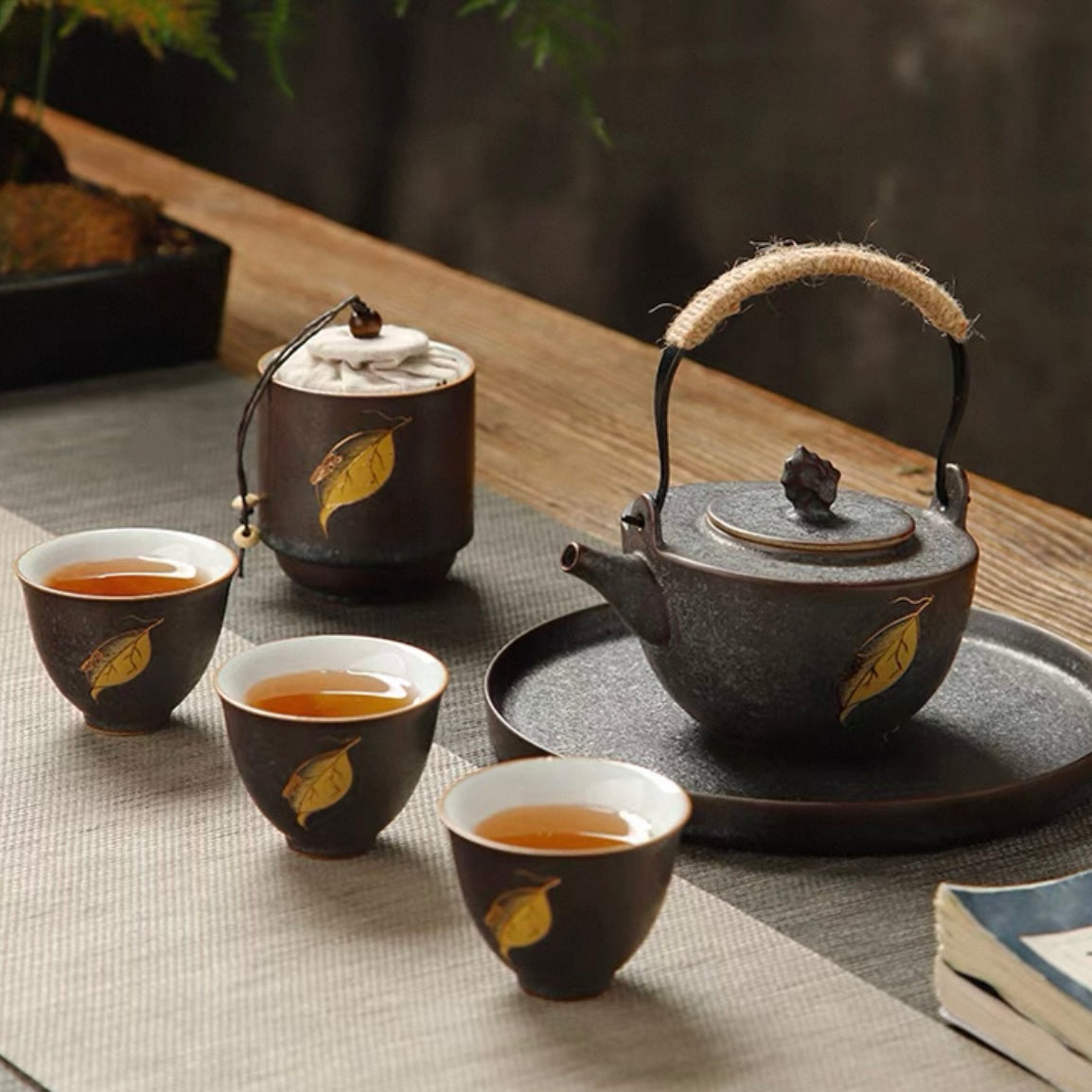 The set includes a teapot, a tea canister, three tea cups, and a tea tray, blending classical charm with modern practicality.