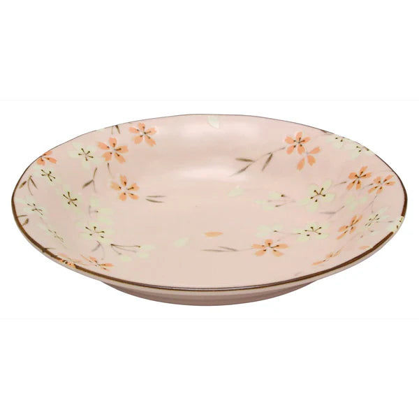 A large pink Kakuni plate for curry or pasta, with a cherry blossoms pattern. This dish is artisan made. Slight variations in shape or color may exist.